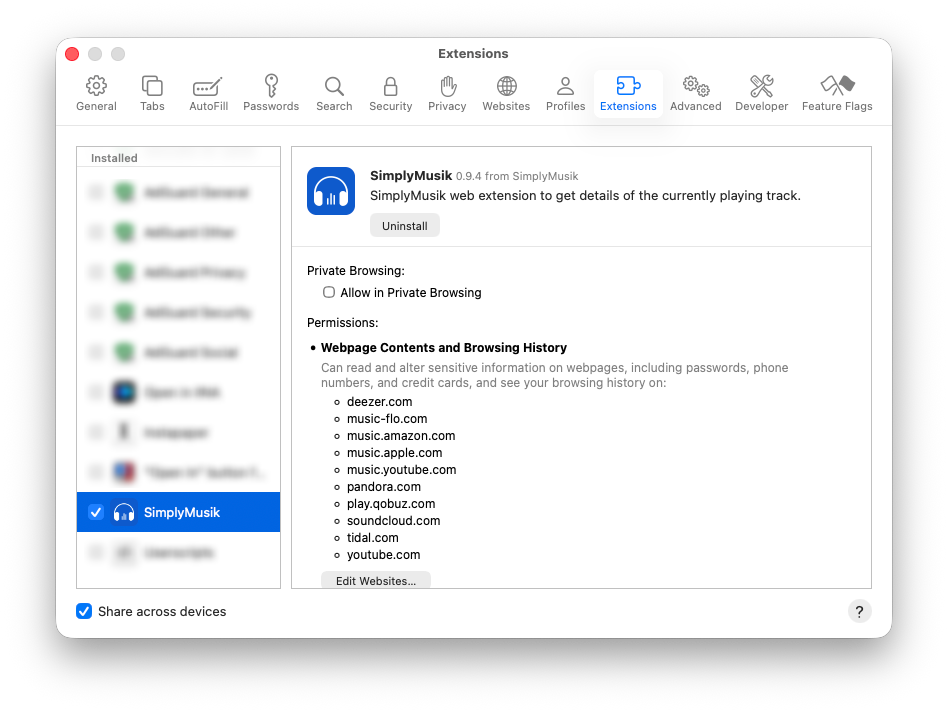 To get track information and control the music player when using web-based players, you need to enable the Safari extension. Please go to Safari Settings > Extensions and check SimplyMusik to activate it. Additionally, when you visit a music website, a permission popup will appear; select 'Always Allow on This Website' to ensure the app can always access and control the player.