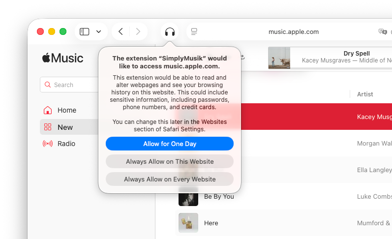 Enable SimplyMusik in Safari Extensions and allow access to music websites.